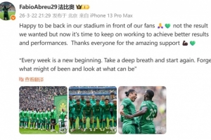 體育資訊3月22日訊 國安外援法比奧更新社媒,談到了本輪主場1-1戰平申花的感受。