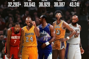 談到自己生涯總得分超越邁克爾·喬丹,上升至NBA歷史第五,杜蘭特笑著說道:“我還有四人需要去超越。”