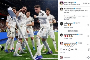 皇馬后衛卡瓦哈爾社媒曬照慶祝勝利,配文:“韌性、團隊精神與對這枚隊徽的敬意。”