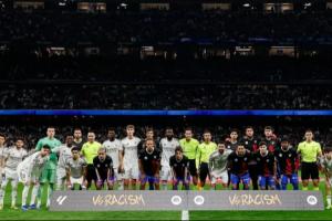 皇馬官推曬出賽前反種族歧視活動的合影,并配文:“團結起來反對種族歧視。”