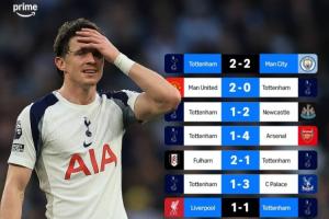 近8場英超聯(lián)賽中,熱刺僅在對(duì)陣曼城和利物浦的比賽中拿到分?jǐn)?shù),其它六場比賽全部輸球。