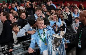 體育資訊3月24日訊 曼城2-0戰勝阿森納奪得聯賽杯冠軍,哈蘭德賽后慘遭一男球迷強吻。