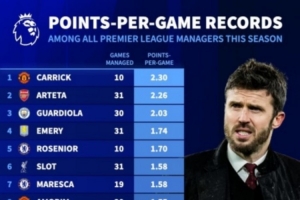 體育資訊3月25日訊 德國轉會市場統計了本賽季英超主帥的場均積分(至少執教3場),并列出榜單,卡里克2.3分居首,阿爾特塔2.26分次席。