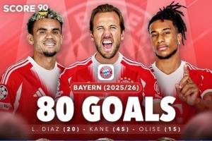 體育資訊3月11日訊 本賽季歐洲五大聯賽的攻擊線,風頭最盛的莫過于拜仁凱恩、迪亞斯、奧利塞組成的三叉戟組合。據score90數據統計,拜仁三叉戟截止目前已經打進80球,距離當年在歐洲所向披靡的巴薩MSN組合最高單賽季紀錄131球,還差51球。