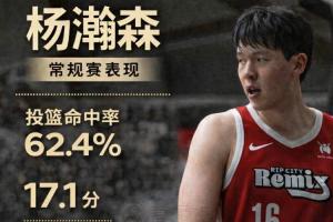 楊瀚森在常規(guī)賽出戰(zhàn)了14場,投籃命中率62.4%,三分球32.1%,罰球命中率75%,場均17.1分9.2籃板3.1助攻0.7搶斷1.6蓋帽。