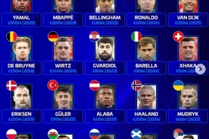 體育資訊3月29日訊 德國轉會市場盤點了歐足聯旗下各隊歷史身價最高球員,亞馬爾、哈蘭德和姆巴佩2億歐并列榜首,C羅最高1.2億歐。