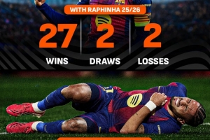 本賽季,在拉菲尼亞出戰的情況下,巴薩取得了27勝2平2負的戰績,只輸掉了6%的比賽。而在巴西邊鋒缺陣的情況下,巴薩戰績僅為9勝1平5負,輸掉了33%的比賽。