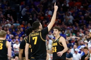 當完賽的蜂鳴器響起的瞬間,愛荷華大學(xué)的隊員們互相擁抱慶祝,他們淘汰了衛(wèi)冕冠軍佛羅里達大學(xué),自1999年以來首次晉級甜蜜十六強。
