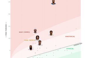 Unethical Hoops的“無德”指數主要依靠罰球數量vs出手數的比值來進行計算,數值越大,越是“沒有道德”;