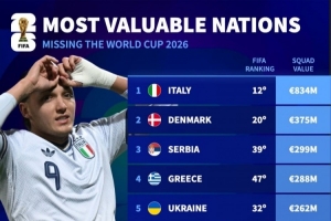 無緣世界杯球隊身價排名:意大利8.34億歐居首,丹麥3.75億歐次席