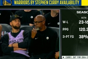 勇士主場迎戰(zhàn)馬刺,鏡頭給到庫里時,轉播方給出了本賽季有無庫里勇士戰(zhàn)績對比。