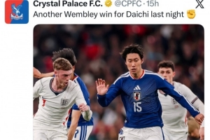 水晶宮官推也曬出鐮田大地的比賽照,并配文寫道:“昨晚大地再一次在溫布利取得比賽勝利!”