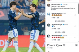 體育資訊4月2日訊 阿根廷前鋒阿爾瓦雷斯更新社媒動態,曬出與梅西慶祝的合照。