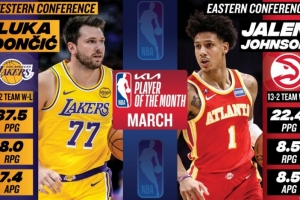 體育資訊4月3日訊 今日NBA官方宣布,湖人球星東契奇和老鷹球星杰倫·約翰遜分別當選三月份西部和東部聯盟月度最佳球員。