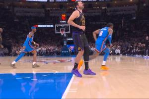 湖人今日客戰雷霆,第三節,東契奇疑似無對抗腿筋受傷。
