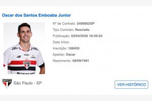 放棄6673萬(wàn)元薪酬!巴西足協(xié)注冊(cè)系統(tǒng):34歲奧斯卡與圣保羅解約!