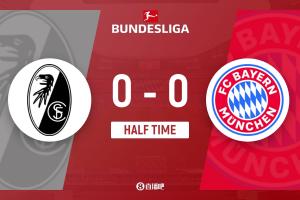 上半場傷停補時3分鐘,半場結束,拜仁暫0-0弗賴堡。