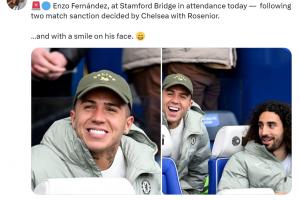 體育資訊04月05日訊 恩佐因為此前言論,被切爾西內部處罰禁賽兩場。今天恩佐現身斯坦福橋觀戰,看起來心情不錯。羅馬諾發文報道。
