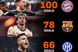 五大聯(lián)賽進(jìn)球榜:拜仁100球、巴薩78球、國(guó)米66球、槍手巴黎各61球