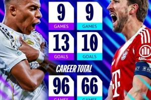 本賽季,姆巴佩和凱恩均在歐冠中出戰9場比賽,姆巴佩打進13球,凱恩則打進10球。職業生涯迄今為止,姆巴佩96場歐冠打進68球,凱恩則是66場歐冠打進50球。