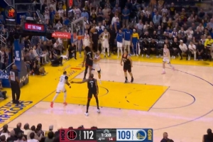 3、在比賽剩余46秒時(shí),追夢(mèng)在禁區(qū)內(nèi)超過(guò)三秒,應(yīng)該吹罰防守三秒違例,勇士獲利。