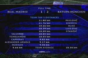 拜仁2-1皇馬跑動數(shù)據(jù):帕夫洛維奇11.80km最多,前五均是拜仁球員