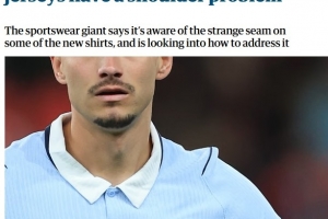 耐克在給《衛報》的一份聲明中承認了球衣肩部設計問題,并表示正在研究可能的解決方案:“在最近的國際比賽期間,我們注意到我們的國家隊球衣在肩縫處存在一個小問題。雖然不影響球衣性能,但整體外觀沒有達到應有的標準。”