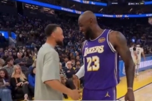 詹姆斯和庫里賽前開心寒暄 鏡頭給到庫里穿的詹姆斯10代簽名鞋