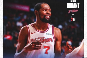 賽后,火箭官方曬出本場杜蘭特的數據海報,KD滿臉笑容。