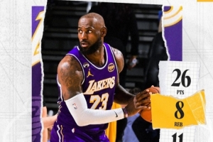 本場比賽,湖人球星詹姆斯上場32分鐘,17投11中得到26分8籃板11助攻2搶斷1蓋帽。