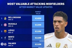 德轉列前腰身價榜:貝林厄姆壓穆西亞拉居首,費爾明、維爾茨在列