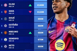 體育資訊4月13日訊 德轉更新了足壇右邊鋒身價情況,亞馬爾以2億歐居首,奧利塞以1.4億歐位居次席。