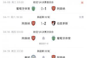歐冠1/4決賽,阿森納客場1-0戰勝葡萄牙體育;英超方面首回合交手,阿森納1-1戰平曼城!
