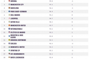 OPTA全球俱樂部實力榜:拜仁、阿森納、曼城、巴薩以及巴黎居前5