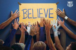 巴薩官方動員歐冠次回合:球員手摸“相信”,致敬《足球教練》梗