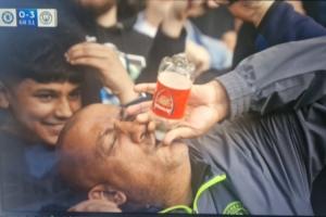 體育資訊04月13日訊 英超第32輪,曼城客場3-0完勝切爾西。比賽過程中轉播鏡頭對準了看臺上的一位曼城球迷,他拿著印有阿森納標志的水瓶瘋狂嘲諷慶祝,瞬間走紅。