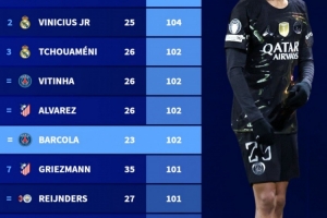 巴爾科拉(巴黎圣日耳曼):102場(chǎng)