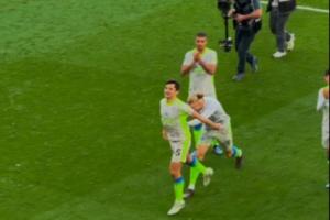賽后曼城全隊向球迷謝場時,胡桑諾夫有些不好意思接受球迷的掌聲,哈蘭德一把把他推到了球迷面前。