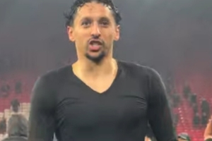 巴黎隊長馬爾基尼奧斯賽后與球迷互動,面對熱情的球迷,已經送出球衣的他脫下球褲扔向看臺。