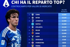 體育資訊4月16日訊 德轉按后衛+門將、中場、前鋒統計意甲各隊球員身價,中場球員總身價中,科莫1.66億歐居首,國米第二,尤文與那不勒斯并列第三。