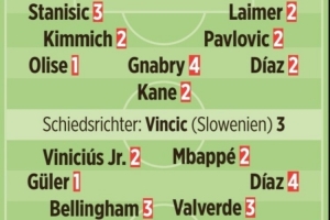 圖片報評分:于帕、居萊爾1分 姆巴佩2分 諾伊爾5分 卡馬文加6分