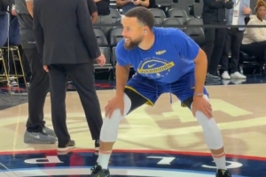 GIF-庫里踩著中場Logo投三分 球經過反彈精準命中