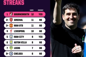 體育資訊4月16日訊 據(jù)Opta統(tǒng)計(jì),伯恩茅斯是本賽季英超連續(xù)不敗場次最多的球隊(duì)。