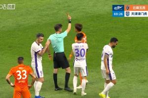 體育資訊04月17日訊 中超第6輪,云南玉昆vs天津津門虎,比賽第70分鐘,張宸梁身后拉倒謝蒂內,兩黃變一紅被罰下,玉昆0-2+少一人作戰!VAR介入檢查是否構成直紅,最后維持黃牌判罰。