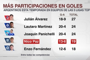 據ESPN統計,尼科·帕斯是本賽季參與進球第四多的五大聯賽阿根廷球員。
