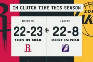 據(jù)統(tǒng)計(jì),本賽季常規(guī)賽湖人關(guān)鍵時(shí)刻戰(zhàn)績(jī)?yōu)?2勝8負(fù),排名聯(lián)盟第一;火箭關(guān)鍵時(shí)刻戰(zhàn)績(jī)?yōu)?2勝23負(fù),排名聯(lián)盟第16。