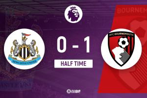 上半場傷停補時2分鐘,半場結束,紐卡斯爾聯暫0-1伯恩茅斯。