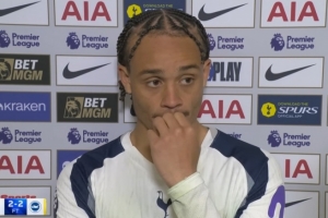 體育資訊4月19日訊 熱刺在本輪英超2-2遭布萊頓絕平,取得進球的哈維·西蒙斯在賽后接受采訪被問及相關話題。