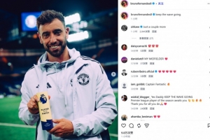 B費也在賽后通過社媒曬出自己手捧英超官方全場MVP獎杯的照片,并配文:“繼續保持當前的勢頭!”