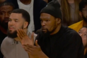 GIF-杜蘭特和范弗里特化身啦啦隊 在場邊加油鼓勁